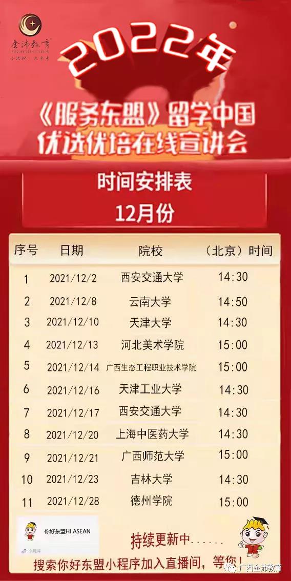 2021122日起,由我司聯(lián)合多所高校開(kāi)展的“2022年留學(xué)中國優(yōu)選優(yōu)培線(xiàn)上直播宣講會(huì )將積極利用直播新形勢在你好東盟微信小程序上進(jìn)行開(kāi)播。學(xué)校和師生、家長(cháng)可通過(guò)小程序你好東盟、FacebookYoutube直播等多種途徑收看本次宣講會(huì )。
