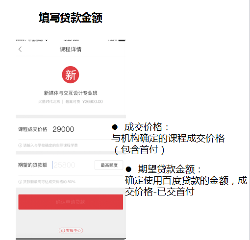 方式三:通過(guò)門(mén)店選定課程,填寫(xiě)貸款金額【成交價(jià)格:與機構確定的課程成交價(jià)格(包含首付);期望貸款金額:確定使用百度貸款的金額,成交價(jià)格-已交首付】