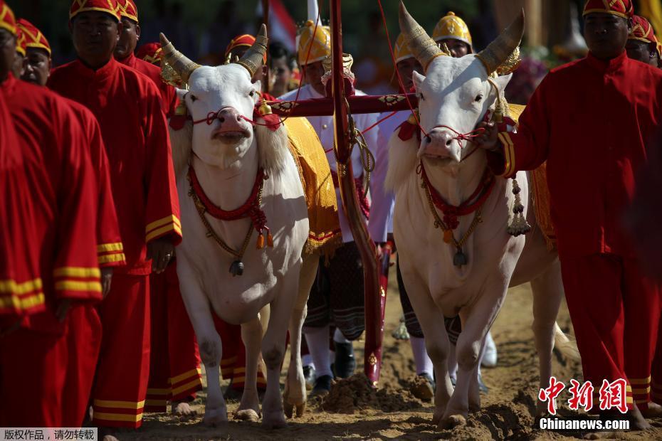 接著(zhù)由婆羅門(mén)教士率領(lǐng)神牛、主犁官、女祭師進(jìn)行模擬耕種和播種。在神牛選吃稻谷、玉米、綠豆、芝麻、青草、水和酒儀式中,神牛選吃草意味著(zhù)今年雨量充足,牲畜長(cháng)勢良好、榖物水果豐收。