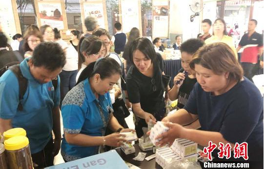 ▲圖為由中國知名中成藥企業(yè)主辦的一場(chǎng)活動(dòng)中,印尼民眾爭相購買(mǎi)太極藿香正汽口服液。鐘欣 攝