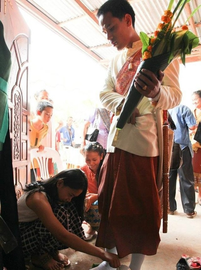 老撾婚禮中有一個(gè)很重要的儀式,老撾語(yǔ)稱(chēng)“女婿游行”。即婚禮當天,新郎按傳統風(fēng)格打扮,穿兜襠褲,配寶劍,手拿甘蔗和鮮花(象征保衛愛(ài)情和創(chuàng )造甜蜜美好的新生活)前往新娘家。在距離新娘家還有一段距離時(shí),所有人必須下車(chē),步行向新娘家走去。為體現男方家的誠意和身份,迎親隊伍會(huì )制造隆重熱烈的場(chǎng)面和氣氛,一路敲鑼打鼓,鳴放鞭炮,載歌載舞。