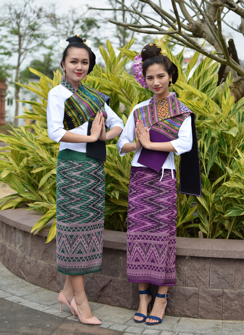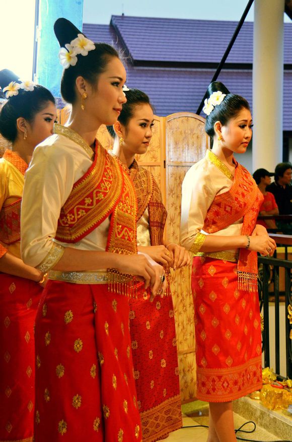 老撾女士一般都有多套正裝行頭,面料看起來(lái)明顯出自于手工紡織。女士的正裝色彩斑斕,配上做工考究的民俗圖案和珠璉佩飾,給人一種質(zhì)樸、莊重的感覺(jué)。年輕女士的正裝顏色豐富,以鵝黃、桔橙、粉色、淡紫為主要色彩;中老年女士的正裝則青睞深紫、咖啡、墨綠、深藍等顏色。老撾人在集會(huì )時(shí),一定會(huì )正裝出席,一改平日休閑、隨意的裝束。