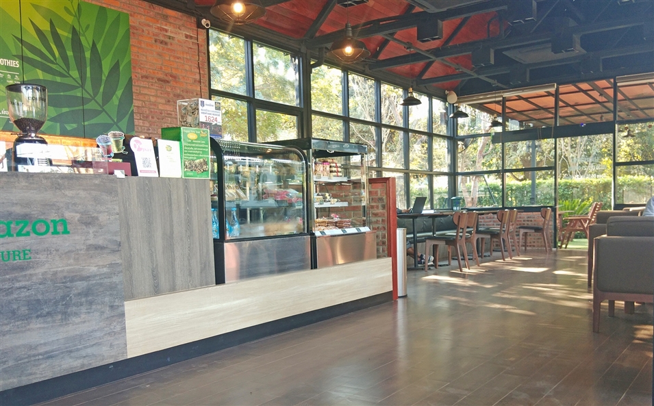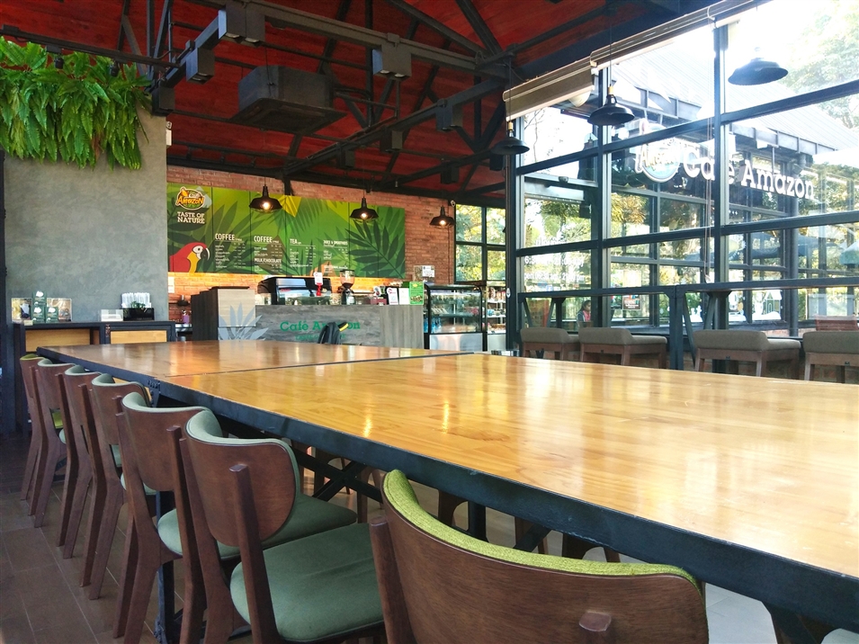 亞馬遜咖啡館的紅磚外墻與干凈明亮的落地窗相映,充滿(mǎn)休閑氣息。室內寬敞整潔,歸本主義的原木桌椅,適合打發(fā)午后的閑暇時(shí)光。
