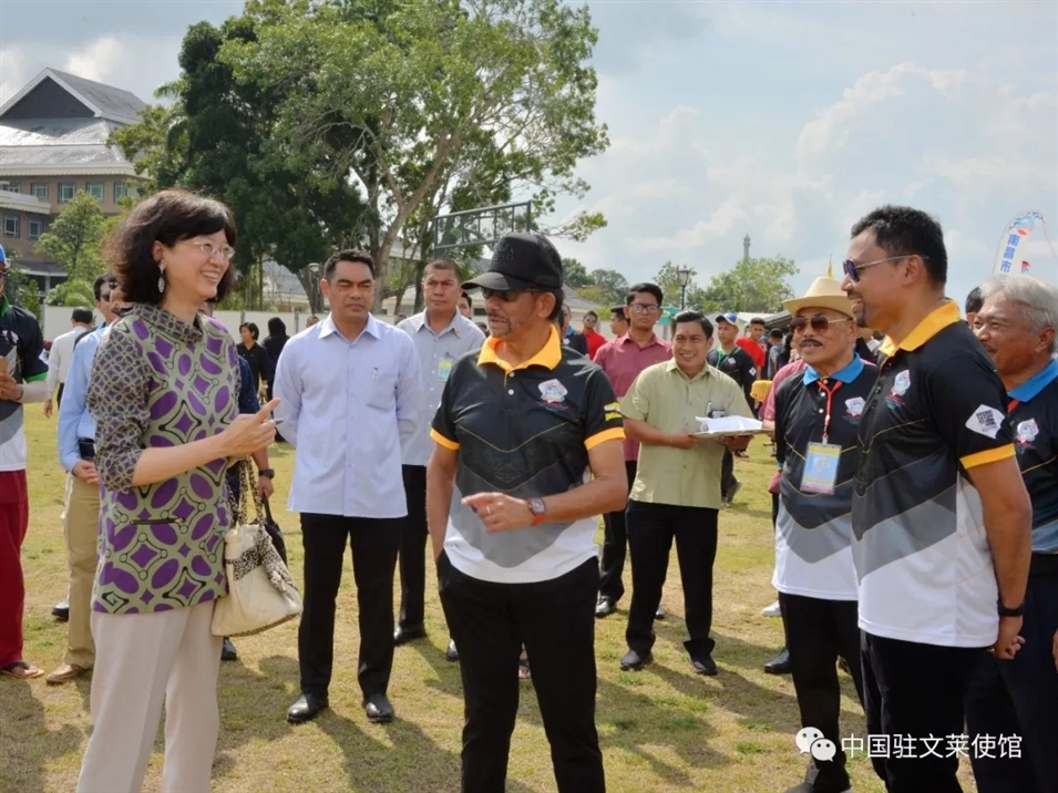 317日,于紅大使應邀出席文萊首屆國際風(fēng)箏節開(kāi)幕式。于紅大使在開(kāi)幕式前看望中國選手,為他們加油鼓勁。于紅大使還陪同文萊蘇丹、王儲等王室成員和中國選手交流。