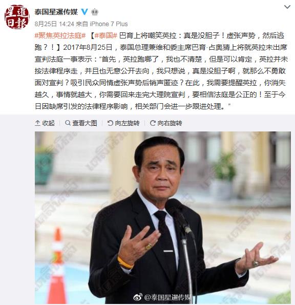 【環(huán)球網(wǎng)綜合報道】泰國前總理英拉卷入大米收購瀆職案,原定周五(25日)在最高法院判刑,但英拉當日未有出庭,去向成謎。法新社26日引述泰國軍政府人士的消息稱(chēng),英拉現時(shí)身處阿聯(lián)酋迪拜,很有可能前往英國尋求政治庇護。